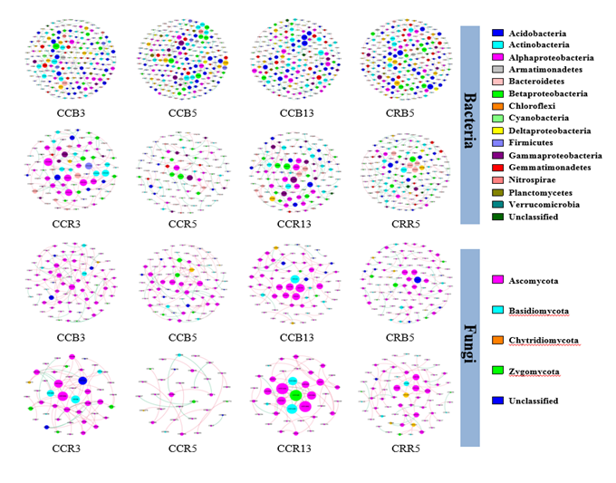 圖2不同處理下細(xì)菌與真菌群落的網(wǎng)絡(luò)結(jié)構(gòu)