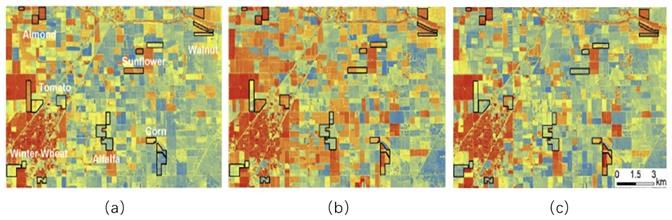 基于全極化UAVSAR數(shù)據(jù),研究人員計(jì)算得到全年Cloude–Pottier以及Freeman–Durden極化參數(shù),并利用極化參數(shù)及原始的雷達(dá)后向散射系數(shù)(HH,HV,VV)對農(nóng)作物全年生長動態(tài)進(jìn)行了監(jiān)測。研究結(jié)果表明,常綠作物(例如果樹)及飼料作物(例如苜蓿草)整個生長季后向散射值十分穩(wěn)定,而冬小麥及夏季大田作物則變化劇烈,表現(xiàn)為從出芽階段到生物量峰值時段的快速上升,以及隨后到衰老階段的急速下降。整體上,6月和10月影像上極化信號異質(zhì)度很高,而7-8月份信號均質(zhì)度很高。