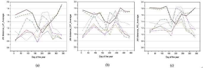 圖2. 每種作物與其它作物間的全年平均JM距離值變化圖 (a) 原始后向散射系數(shù)(HH, HV, VV), (b) Cloude-Pottier極化參數(shù), (c) Freeman-Durden極化參數(shù).