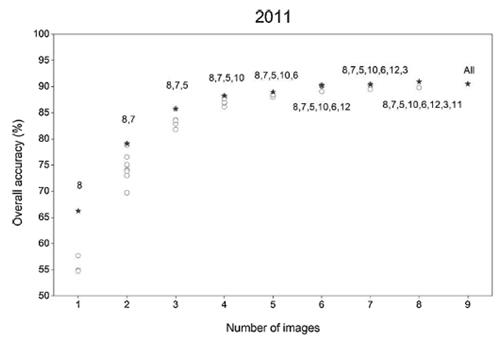 圖3. 基于前向影像選擇方法得到的最優(yōu)遙感影像組合產(chǎn)出的分類精度變化圖