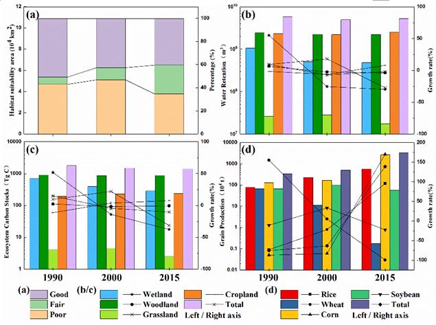 圖1 1990-2015年三江平原生態系統服務變化:不同等級生境適宜性面積(a)、主要土地覆被類型的水源涵養(b)、主要土地覆被類型的生態系統碳儲量(c)、糧食產量(d)
