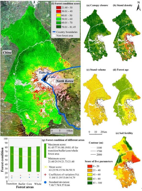 中科院東北地理所地理景觀遙感學科組研究人員選取林齡、郁閉度、立木密度、蓄積量和土壤肥力等重要生態參數作為評價指標,基于ALOS-2L波段雷達數據、Sentinel系列衛星的C波段雷達和可見光影像、ALOSDSM數據和大量的野外調查數據,開展了長白山森林結構和功能參數的遙感反演研究,并將其應用于森林健康狀況評價。該研究系統分析了遙感因子與各參數的關系,并通過統計回歸、隨機森林、隨機森林克里金等空間建模方法,反演獲得長白山國家自然保護區林齡、郁閉度、立木密度、蓄積量和土壤肥力等參數的空間分布;在此基礎上,利用主成分分析法確定各參數權重,構建了長白山國家自然保護區森林健康狀況評價模型,并對評價結果進行了不確定性分析。