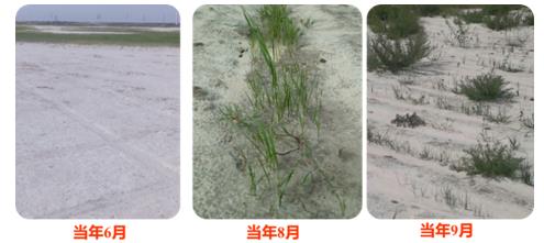 該方法主要是在生長季早期,用犁在鹽堿地中開一條10-15cm的溝,在溝中覆蓋沙土,在沙土中播種羊草種子,在周圍鹽離子沒進入沙土中時,羊草能夠迅速萌發,并利用羊草成株耐鹽堿能力較高并且能夠無性繁殖的特點,迅速恢復植被(圖1)。該方法特點是,利用植物生長的特性、施加區域現有資源,為生物早期生長營造微環境。這種恢復方法成本低、效果好(圖2),為鹽堿化草地恢復提供了重要的科技支撐。