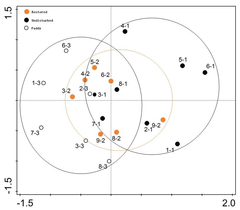 圖3 基于Bray-Curtis算法的樣地(天然濕地、恢復濕地、開墾農田)NMDS排序圖