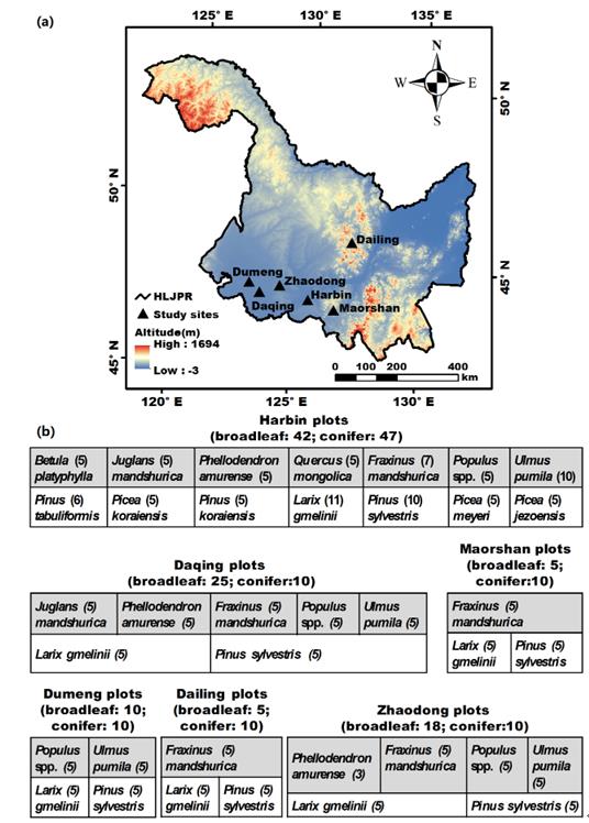 中科院東北地理所城市森林與濕地學科組的研究人員對6個地點(圖1)的14種常見造林樹種共202塊樣地進行了樣品采集。并將土壤進行組分分級:顆粒團聚體(0.25–2 mm),微團聚體 (0.053–0.25 mm)以及泥沙黏土組分(<0.053 mm)。通過多因素方差分析MANOVA (multiple analysis of variance) 和協方差分析MANCOVA (multiple analysis of covariance)去除不同地點造成的影響,量化了闊葉林-針葉林礦質土壤的團聚特性、有機碳以及總氮的差異。