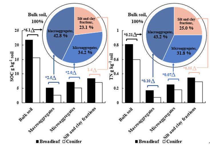 圖2. 闊葉林-針葉林土壤組分團聚特性、有機碳以及總氮的差異