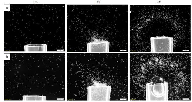 圖3:大豆孢囊線蟲(chóng)對(duì)鹽(NaCl)的趨化性。a: 5h; b: 24h.