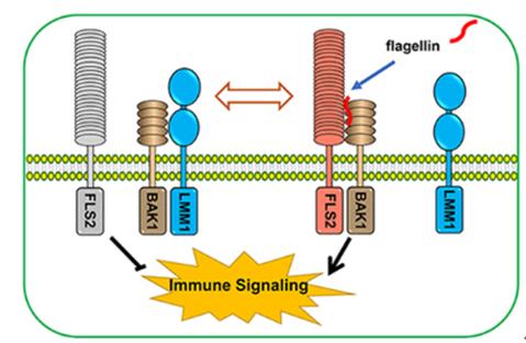 無病原菌侵入時(shí),GmLMM1與病原體模式識(shí)別受體BAK1結(jié)合,免疫反應(yīng)被抑制;當(dāng)病原菌(flagellin)侵入植物細(xì)胞后,可以誘導(dǎo)病原菌特異模式識(shí)別受體FLS2和BAK1結(jié)合,以觸發(fā)下游免疫信號(hào)。 GmLMM1在免疫激活過程中可以調(diào)節(jié)FLS2-BAK1相互作用,從而控制適度的免疫激活。