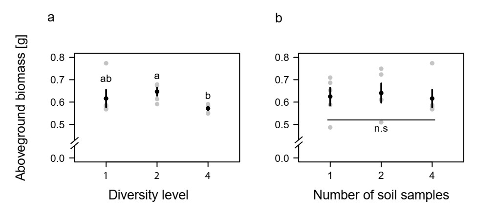 針對以上研究缺口,中科院東北地理與農(nóng)業(yè)生態(tài)研究所生物入侵生態(tài)學(xué)研究團隊與德國康斯坦茨大學(xué)生態(tài)學(xué)研究團隊借鑒植物-土壤反饋的研究方法,利用溫室控制實驗,探究了本地植物多樣性如何通過土壤微生物調(diào)控外來植物的入侵過程。實驗第一階段,研究人員利用不同的本地植物物種馴化土壤微生物群落,并測定了不同植物馴化后的土壤微生物群落多樣性。實驗第二階段,研究人員將來自不同植物馴化過的土壤人工混合,組成不同的植物多樣性梯度的馴化土壤(分別是多樣性1、2和4),然后在這些土壤里種植外來植物,并測定其生長表現(xiàn)。