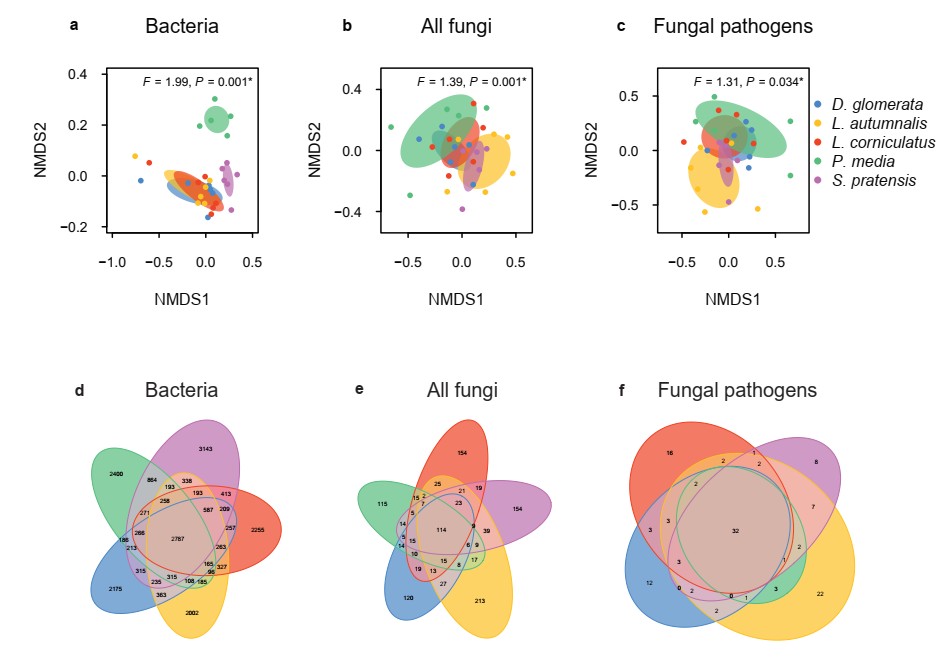 圖三 不同本地植物馴化過的土壤細(xì)菌(a,d),真菌(b,e)和真菌病原體(c,f)群落組成的差異(β多樣性和非共享的ASV)。不同顏色代表不同本地植物。NMDS圖中,不同點代表土壤樣品。