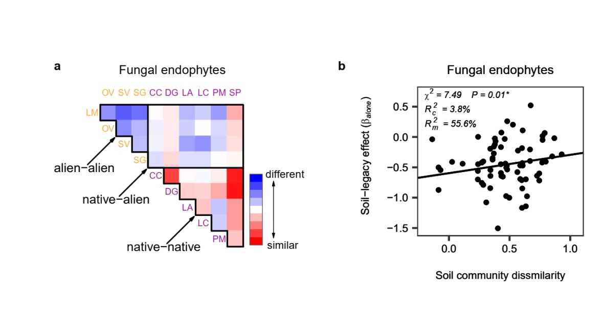 圖3 不同植物土壤微生物群落的相似度(a)。藍色代表相似度低,紅色代表相似度高。左上角為外來植物之間的相似度,右下角為本地植物之間的相似度,中間為外來植物與本地植物之間的相似度。土壤微生物群落相似度與土壤遺留效應的關系(b)。正的土壤遺留效應代表植物對土壤馴化促進后來植物的生長。本圖僅展示內生真菌,細菌,整體真菌的結果具有相同趨勢,但不顯著,具體可見原文。