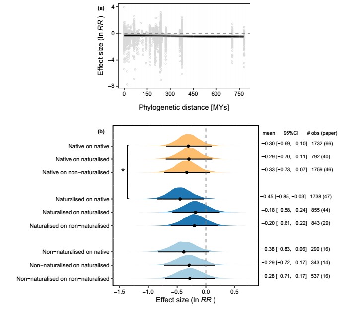 Figure 3 Effects of evolutionary history on allelopathy. (a) Effect of phylogenetic distance between allelopathy and test species on allelopathy. The curve of the estimated effect is shown with its 95% credible interval. (b) Effects of origin of allelopathy and test species on allelopathy when tested with the leachate method. Effects of native, non-naturalised alien and naturalised alien allelopathy species are shown in dark blue, light blue and orange. For each category (parameter), the posterior distribution is plotted with the mean and 95% credible interval. The text on the right displays the mean, 95% credible interval (CI), and the number of observations (obs) and papers. Negative values of the effect size (ln RR) indicate that allelopathy inhibits plant performance. An asterisk indicates significant difference between reference level (native on native) and the other.