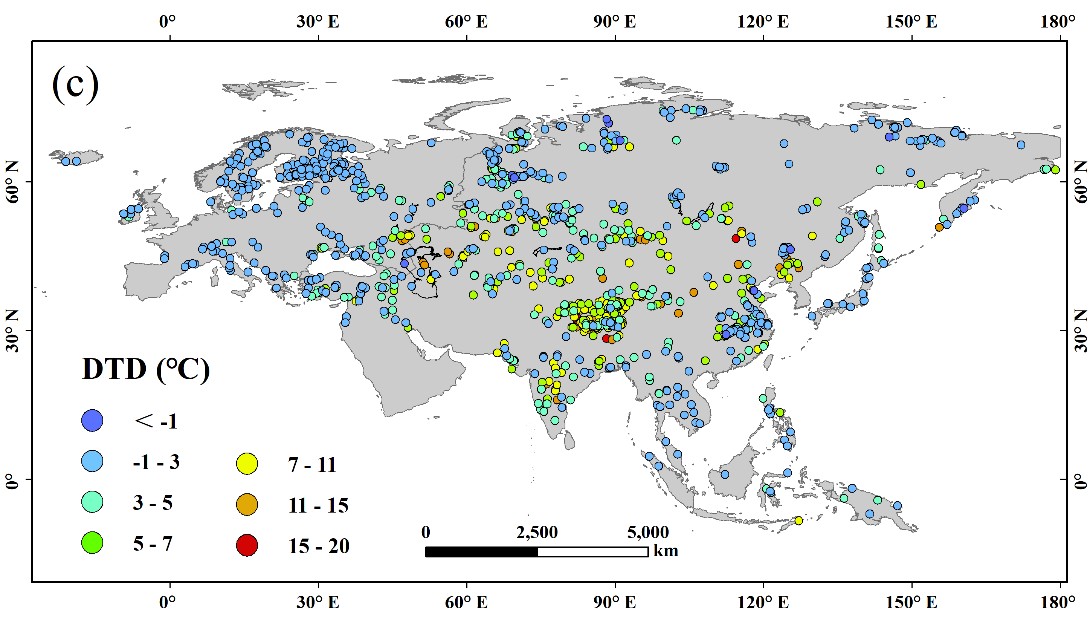 圖2歐亞大陸湖泊晝夜溫差空間分布
