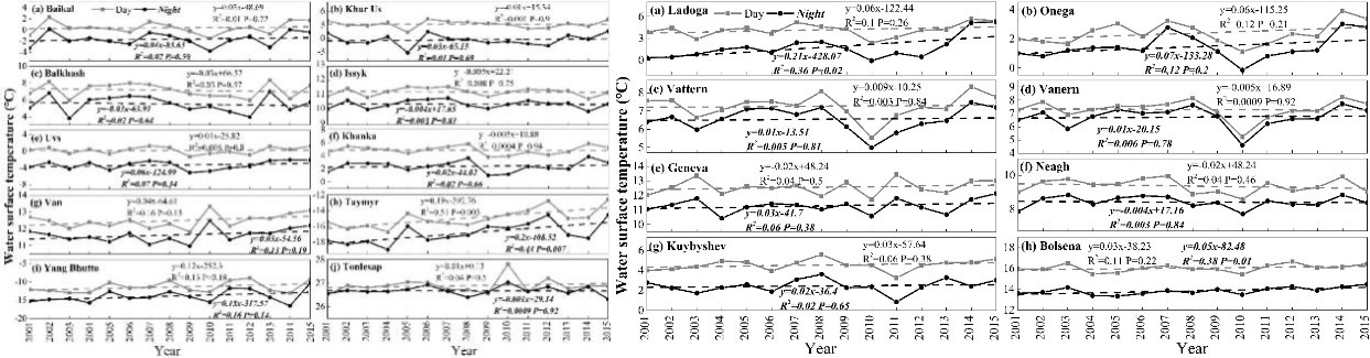 歐亞大陸分布著眾多湖泊和水庫(kù),總面積約占全球內(nèi)陸水體總面積的46%。歐亞大陸地形復(fù)雜,氣候帶分布廣泛,湖泊存在著梯度差異。盡管湖泊溫度研究已在世界范圍內(nèi)進(jìn)行了不同規(guī)模的研究,但湖泊溫度在歐亞大陸湖泊中的分布模式和湖泊溫度差異驅(qū)動(dòng)因素尚待分析。東北地理所水環(huán)境遙感團(tuán)隊(duì)利用MOD11A2產(chǎn)品提取湖泊表面溫度信息,根據(jù)柯本氣候分區(qū)和湖泊面積在歐亞大陸選擇了861個(gè)湖泊和237個(gè)水庫(kù),研究了歐亞大陸湖泊溫度分布格局,并分析了長(zhǎng)時(shí)間序列湖泊溫度變化趨勢(shì)。研究發(fā)現(xiàn)相對(duì)于其他湖泊來(lái)說,高緯度和青藏高原的湖溫更低。相比于白天,夜晚的湖泊溫度空間異質(zhì)性更小。在2001-2015年期間,占湖泊總數(shù)70%以上的湖泊溫度呈現(xiàn)明顯的上升趨勢(shì)。高緯度湖泊以及熱帶雨林地區(qū)的湖泊,晝夜溫差的變化最小。在影響因素方面,氣溫與湖泊溫度之間的相關(guān)關(guān)系最好(白天R2=0.71;夜間R2=0.87)。另外湖泊的深度、面積、海拔以及水源情況都會(huì)對(duì)湖溫產(chǎn)生影響。研究結(jié)果對(duì)未來(lái)氣候變化情境下湖泊的響應(yīng)、湖泊與大氣之間的熱量交換和開展冰清預(yù)報(bào)等具有重要意義。