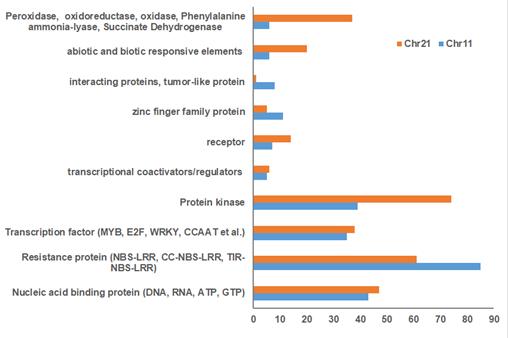 圖2:基于棉花Unigene數據庫對Chr11抗性基因簇和Chr21染色體的同源區域的應激反應元件(stress response elements)的比較