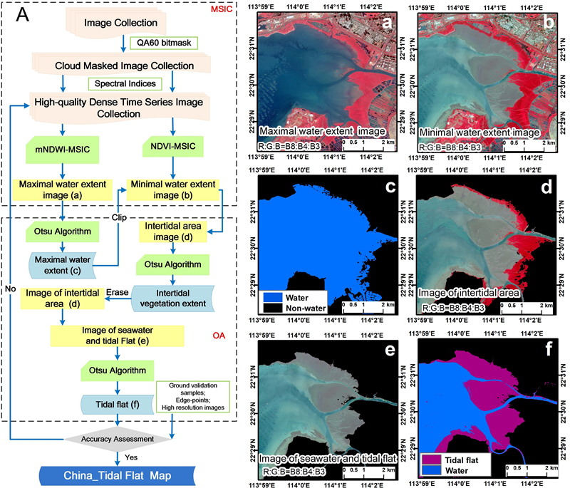 圖1. 基于Sentinel-2密集時間序列影像的MSIC-OA灘涂制圖流程(A),及每步的結果(a-f)。