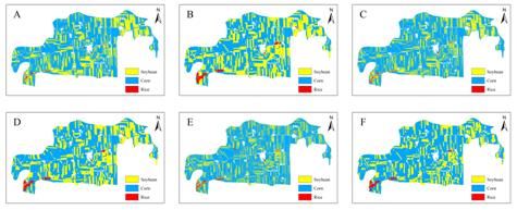 圖2 不同處理方式下克山農場作物分類結果(A-F)