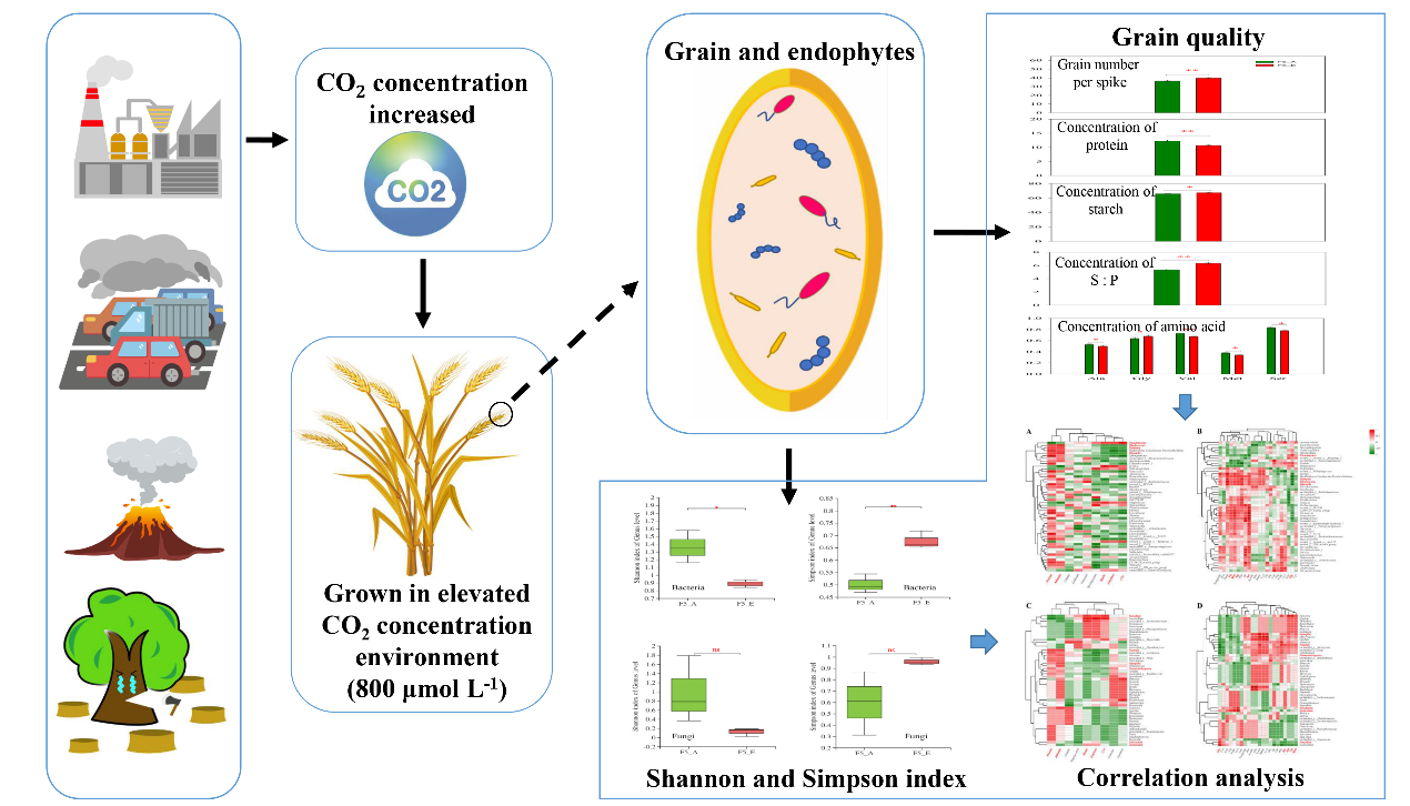 大氣中CO2濃度從工業革命前的280 μmol L-1增加到了2019年的409.8 μmol L-1,預計在2100年上升至900 μmol mol-1左右。大氣CO2濃度升高會直接影響小麥碳氮代謝和籽粒化學成分,從而顯著影響小麥籽粒品質。植物內生微生物在作物響應氣候變化方面起了關鍵作用,微生物種類、豐度的改變與寄主植物生長發育密切相關。籽粒內生菌多樣性對植物的環境響應能力和生產力具有重要影響。然而,在未來大氣CO2升高的環境條件下,籽粒內生微生物多樣性與小麥的品質形成之間的關系仍未可知。為此,東北地理所科研人員將小麥連續5代進行高CO2濃度處理后收獲籽粒,分析了小麥籽粒品質與籽粒內生微生物多樣性之間的關系。