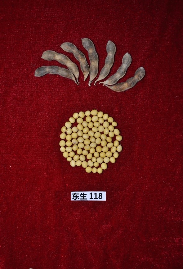 “東生118” (審定編號:吉審豆20210028)為高產、高油大豆新品種。該品種以吉育79為父本,黑河43為母本。2019-2020年區域試驗平均公頃產量2977.4公斤,比對照吉育86增產7.1%;2020年生產試驗平均公頃產量2980.1公斤,比對照吉育86增產4.6%。“東生118”品種亞有限結莢習性,平均株高93.5厘米,主莖型結莢,主莖節數16.9個,以三粒莢為主,莢熟時呈深褐色。圓葉、白花、灰毛,籽粒圓形,種皮黃色,無光,種臍黃色,平均百粒重22.6克。人工接種鑒定,高抗大豆花葉病毒1號株系,抗大豆花葉病毒3號株系。兩年平均籽粒粗蛋白質含量38.53%,粗脂肪含量22.59%。
