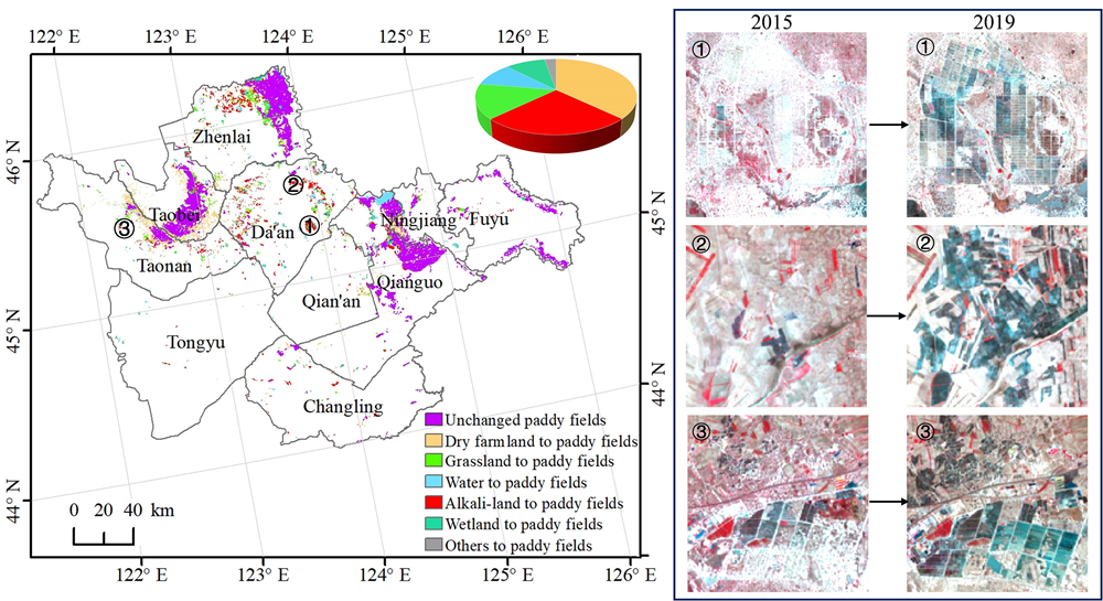 鹽堿地在吉林西部分布廣泛,面積約為160多萬公頃,是吉林省為國家增產千億斤糧食能力的重要土地后備資源.目前,隨著鹽堿地種稻技術的日趨成熟以及國家和地方政策的支持,近年來,吉林西部大面積的鹽堿地正在向水稻田轉變(圖1)。鹽堿地改良種稻極大地改變了地表生物地球物理特征,顯著影響地表和大氣之間的能量和水分交換過程。研究和評估鹽堿地變化通過改變地表水熱分配格局來影響區域氣候的效應和機理,對于揭示以人類活動為主導的土地利用變化在全球和區域氣候變化中的貢獻,科學認識并預估鹽堿地種稻對區域生態環境的影響都具有重要意義。然而,目前針對鹽堿地種稻的空間格局及其對區域氣候的影響方面尚缺乏充分的評估。