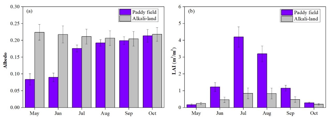 東北地理所土地系統遙感學科組研究人員,通過耦合地面氣象觀測數據、衛星遙感觀測數據和區域氣候模式情景模擬的方式,系統評估了吉林西部鹽堿地轉變為水稻田通過改變地表參數主要是葉面積指數和反照率,進而影響局地氣溫和相對濕度的效應和生物地球物理機制?;谶b感觀測的研究結果表明,鹽堿地種稻使葉面積指數顯著增加,主要集中在生長季七月和八月;受水稻田灌水的影響,鹽堿地種稻會導致五、六月份反照率顯著降低。生長季內,葉面積指數和反照率對鹽堿地種稻的響應差異直接影響著地表輻射過程和非輻射過程的權衡。