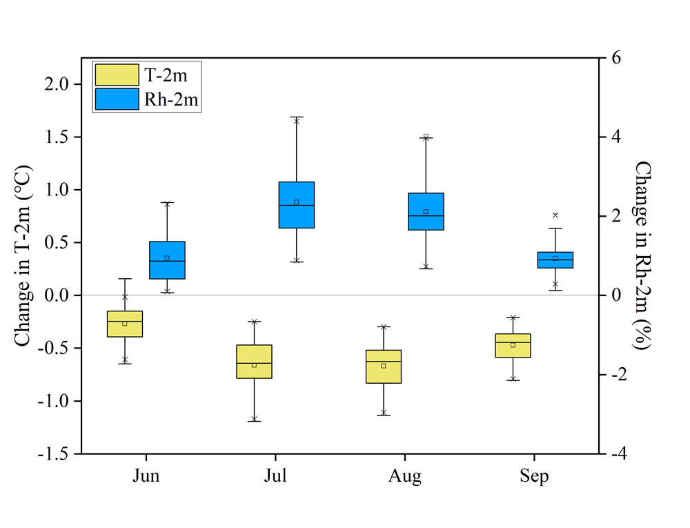 基于數值模擬的研究結果表明,鹽堿地種稻有助于降低局地氣溫和增加相對濕度。這種降溫、增濕效應的幅度在生長季的不同月份表現出顯著的差異性 (圖3),并主要體現在七、八月份,其中,鹽堿地種稻會導致七月份氣溫降低0.66 °C,相對濕度增加2.35%,八月份氣溫降低0.67°C,相對濕度增加2.11%。通過剖析其生物地球物理機制發現,本研究中,以蒸散降溫為主導的非輻射過程在調節區域氣候過程中占主導地位,而蒸散發降溫與反照率增溫的權衡決定了生長季內氣溫和相對濕度的響應差異。