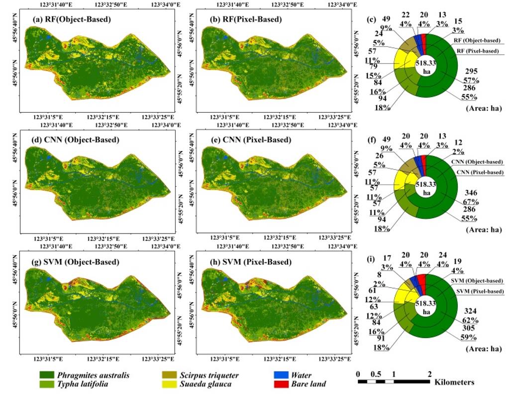 地理景觀遙感學(xué)科組研究人員利用無人機(jī)遙感的優(yōu)勢,集成高光譜成像和機(jī)器學(xué)習(xí)技術(shù),實現(xiàn)了莫莫格核心區(qū)濕地植物群落的遙感分類制圖。通過對高光譜數(shù)據(jù)的多種變換構(gòu)建最優(yōu)特征波段子集,對比了基于面向?qū)ο蠛拖裨娜N機(jī)器學(xué)習(xí)相結(jié)合的6種分類方法的精度,成功實現(xiàn)莫莫格濕地核心區(qū)的濕地植物群落分布的精細(xì)制圖。研究發(fā)現(xiàn):基于面向?qū)ο?隨機(jī)森林的方法得能夠更準(zhǔn)確地刻畫濕地植物群落邊界,提取精度最高達(dá)87.75%;莫莫格核心區(qū)域的蘆葦群落和香蒲群落面積分別為295 ha(57%)和84 ha(16%)。