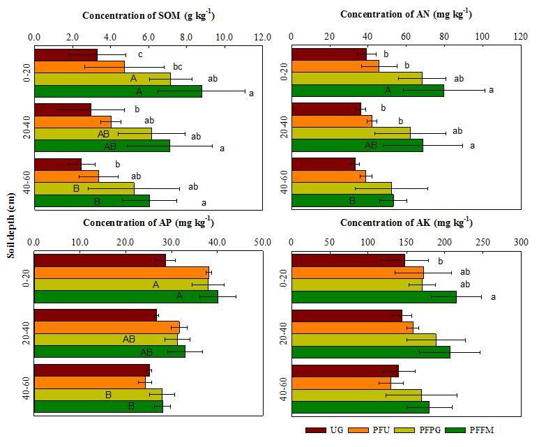 圖2不同改良耕作處理10年的土壤有機質和速效養分含量變化