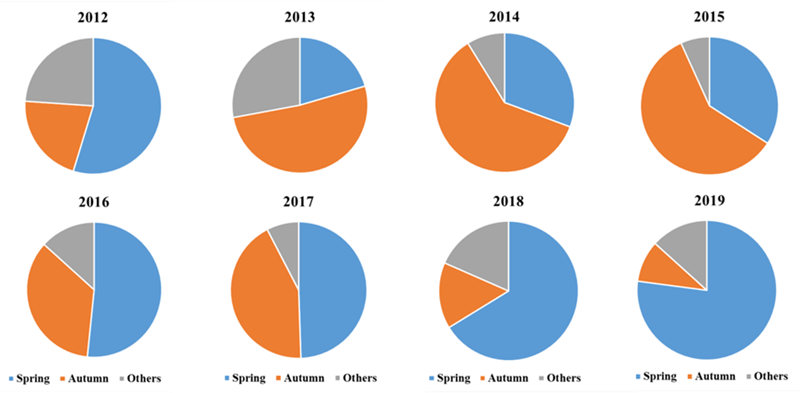 圖1. 2012-2019年東北地區生物質燃燒在春耕前、秋收后及其他時間的比例