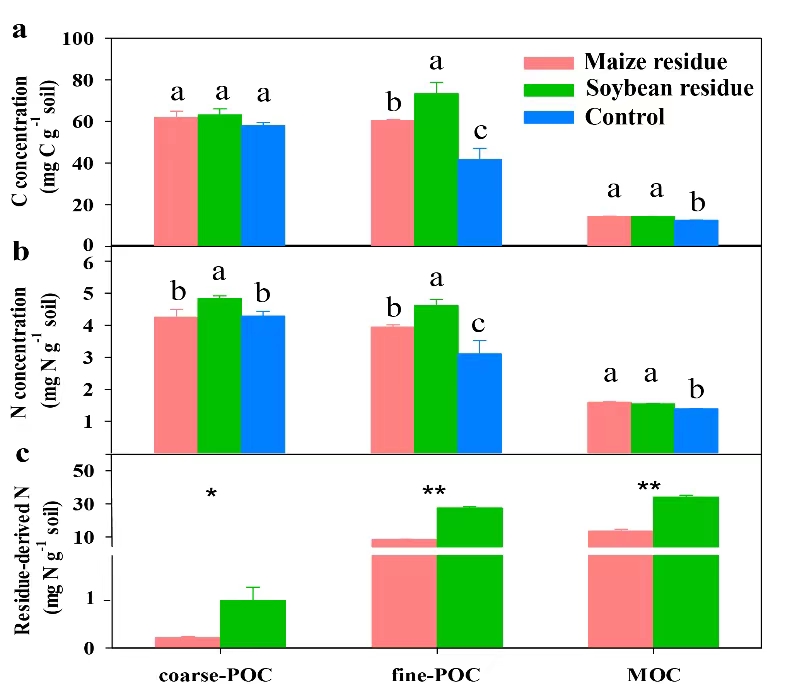 圖1. 培養(yǎng)250天后土壤有機質(zhì)組分中碳(a)、氮(b)以及秸稈來源氮(c)含量