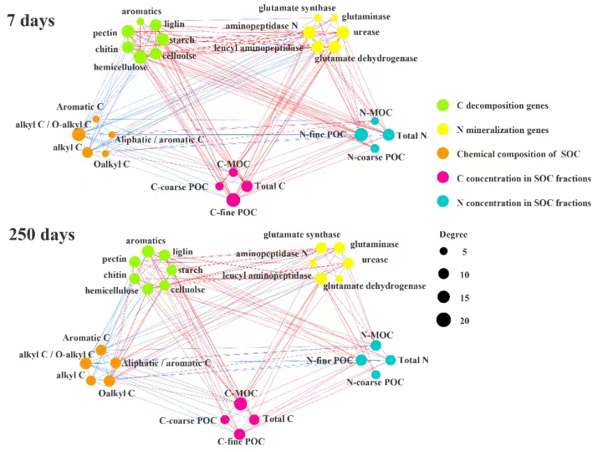 圖3. 培養(yǎng)7天和250天后土壤有機碳結構、有機質(zhì)組分碳氮含量以及氮礦化和碳降解功能基因豐度的相關性網(wǎng)絡