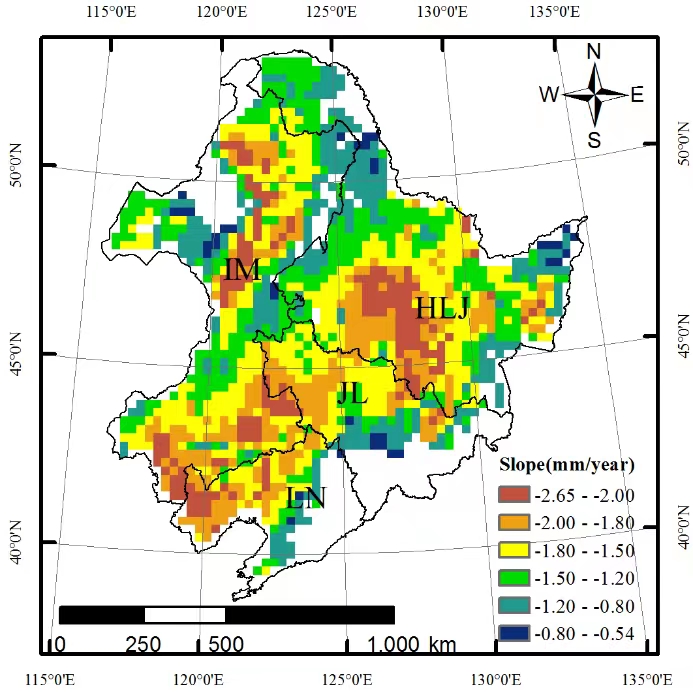 圖1東北地區玉米根區0-200 cm深度范圍土壤水分時間變化率的空間分布特征