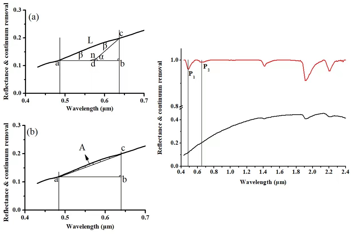 光譜特征參數(shù)是對(duì)光譜曲線吸收特征的描述,在土壤屬性預(yù)測和土壤分類中被很多廣泛使用。對(duì)于土壤分類,因不同土壤的理化性質(zhì)差異會(huì)引起土壤在不同波長上的光譜反射差異,光譜特征參數(shù)可以有效的區(qū)分不同土壤類型。但對(duì)于土壤屬性預(yù)測,光譜特征參數(shù)的使用不如光譜微分和數(shù)學(xué)變換普遍,而且使用的光譜特征參數(shù)都是基于包絡(luò)線去除后提取的吸收深度、吸收面積或吸收位置等。本研究發(fā)現(xiàn),對(duì)于低有機(jī)質(zhì)含量的土壤,隨著SOM含量的變化,在土壤反射光譜曲線上的可見光部分具有較明顯的形狀變化。