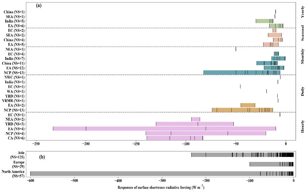 圖2 氣溶膠反饋效應導致亞洲不同地區和時間尺度地面短波輻射強迫的變化情況及其與歐美地區的對比分析