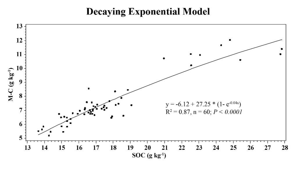 微生物殘體穩(wěn)定性較高,對土壤有機碳(SOC)的長期固存具有重要作用。氨基糖的主要來源是真菌和細(xì)菌且在土壤中很穩(wěn)定。氨基糖對秸稈還田和耕作方式響應(yīng)很明顯,不同作物還田對氨基糖的影響也不一致。中科院東北地理所黑土有機碳與保護性耕作學(xué)科組科研人員依托吉林省德惠市始建于2001年的保護性耕作長期定位實驗開展了相關(guān)研究,包含5個處理:免耕玉米-大豆輪作(NTCS)、秋翻玉米-大豆輪作(MPCS)、免耕玉米連作(NTCC)、秋翻玉米連作(MPCC)、常規(guī)耕作玉米連作且秸稈不還田(CTCC)。于2017年采集了不同深度的土壤樣品,測定氨基糖以計算微生物殘體碳、真菌殘體碳)和細(xì)菌殘體碳及其儲量。三因素方差分析表明,耕作方式、深度及其交互作用對所有氨基糖含量均有顯著影響。然而,不同土層的兩因素方差分析表明,耕作方式對所有氨基糖的影響主要發(fā)生在0-5cm土層。衰減指數(shù)模型(decaying exponential model,圖1)表明微生物殘體碳和SOC之間的關(guān)系(R2=0.87)。耕作對微生物殘體碳、真菌殘體碳和細(xì)菌殘體碳的儲量有很大影響,但對它們在SOC儲存中的分布比例沒有影響。