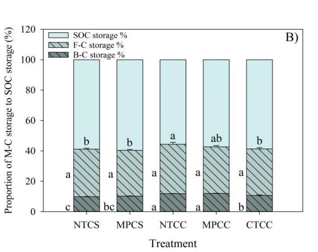 圖2 a)微生物殘體碳、真菌殘體碳以及細(xì)菌殘體碳儲量;b)微生物殘體碳、真菌殘體碳以及細(xì)菌殘體碳儲量與總有機碳儲量比例