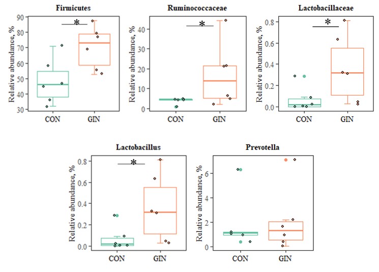 為此,中國科學院東北地理與農業生態研究所草地農牧業學科組成員研究了H. contortus感染對宿主羔羊蛋白質消化、氨基酸代謝、胃腸道微生物組成的影響。研究發現:H. contoutus 感染降低了羔羊采食量和日糧營養物質的表觀消化率(尤其是日糧中蛋白質和脂質的表觀消化率),并降低了羔羊的生長性能。羔羊蛋白質吸收受到影響,瘤胃胃蛋白酶和回腸胰蛋白酶活性顯著降低,血漿氨基酸譜變化顯著。例如,宿主羔羊血漿中蘇氨酸和脯氨酸濃度顯著下降,血漿中天冬氨酸、谷氨酸、絲氨酸和酪氨酸濃度顯著增加,從而彌補由于H. contortus 定植、發育和繁殖造成的宿主羊蛋白質和氨基酸損失(圖1)。感染H. contortus的羔羊的生理代謝和血液生化指標的改變與胃腸道微生物群落組成密切相關。與未感染羊相比,感染羊胃腸道中與碳水化合物、蛋白水解相關的菌屬豐度顯著增加,例如Firmicutes、Ruminococcoceae、Lactobacillaceae、Lactobacillus以及Prevotella等(圖2), 并且羔羊胃腸道中與蛋白質、碳水化合物以及脂肪等營養物質代謝相關的KEGG通路均顯著增加(表1)。本研究結果為系統解析GINs感染和寄生與宿主羊營養代謝的關系提供了理論依據。