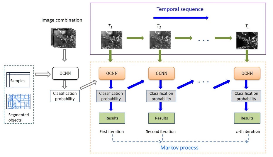近日,中國(guó)科學(xué)院東北地理與農(nóng)業(yè)生態(tài)研究所地理信息系統(tǒng)學(xué)科組研究人員構(gòu)建了一種新穎的時(shí)間序列深度學(xué)習(xí)遙感分類框架TS-OCNN(圖1),充分挖掘了多時(shí)相遙感影像蘊(yùn)藏的豐富信息,提高了多時(shí)相遙感農(nóng)作物分類精度。研究者將時(shí)間序列影像作為一個(gè)隨機(jī)過程,利用馬爾可夫過程模型將時(shí)間序列影像貫序連接,在多時(shí)相聯(lián)合信息挖掘利用基礎(chǔ)上,利用信息傳導(dǎo)的方式將不同時(shí)相影像的分類信息逐步傳遞匯合,從而實(shí)現(xiàn)了多時(shí)相影像聯(lián)合信息和單景信息的共同發(fā)掘和利用。