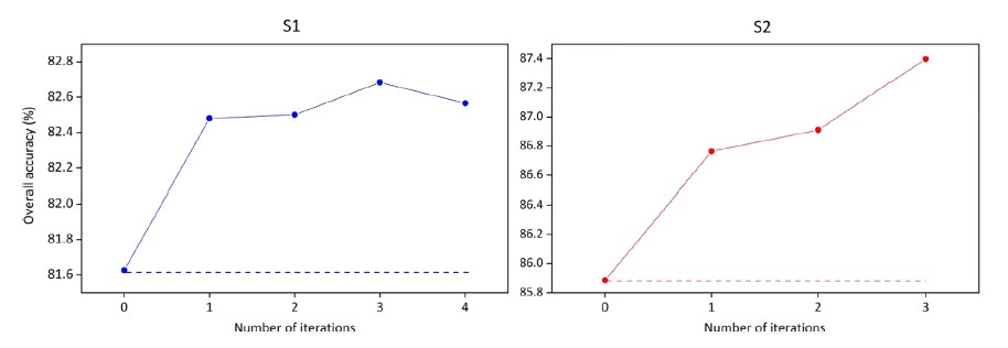 研究人員在復(fù)雜農(nóng)作物分布區(qū)域?qū)Ψ椒ǖ挠行赃M(jìn)行了驗(yàn)證,研究結(jié)果表明,隨著單時(shí)相遙感影像逐步輸入模型,TS-OCNN的分類精度逐步提高(圖2),這表明了每景單時(shí)相影像蘊(yùn)含的作物分類信息得以充分挖掘和利用。相比于目前先進(jìn)的深度學(xué)習(xí)方法(OCNN),TS-OCNN可將農(nóng)作物分類精度提高1-3%,特別是對(duì)于矮小作物(例如飼草類別)分類精度的提高幅度更加明顯(4%左右)。本研究提出的TS-OCNN框架不但能用于農(nóng)作物分類,還能應(yīng)用于其他景觀(例如林地)的遙感分類識(shí)別,具有巨大的應(yīng)用潛力和廣泛的應(yīng)用前景。