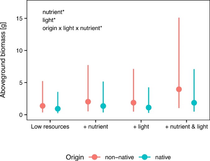 兩個實驗同時發現:在低資源(近似自然條件)或添加一種資源的情境下,外來植物并未比本地植物產生更多的地上生物量(即競爭力相似)。然而,當同時添加養分和光照資源時,外來植物比本地植物更具競爭力(圖2)。該研究結果支持我們提出的假說:多種資源的添加可以極大地減少生態位維度(即限制因素的數量)進而增強外來植物的競爭優勢。因此,未來經歷多種全球變化影響的棲息地可能會更容易被外來植物入侵。