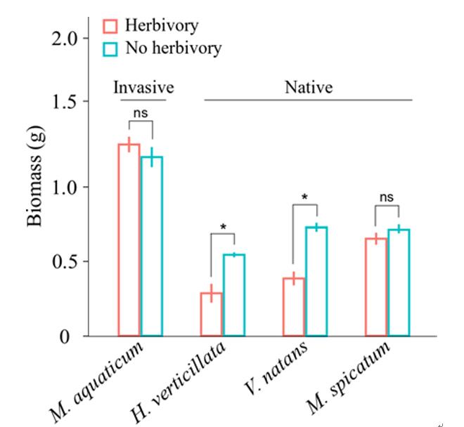 圖4福壽螺取食對外來植物(粉綠狐尾藻)和本地植物(黑藻、苦草、穗狀狐尾藻)生物量的影響
