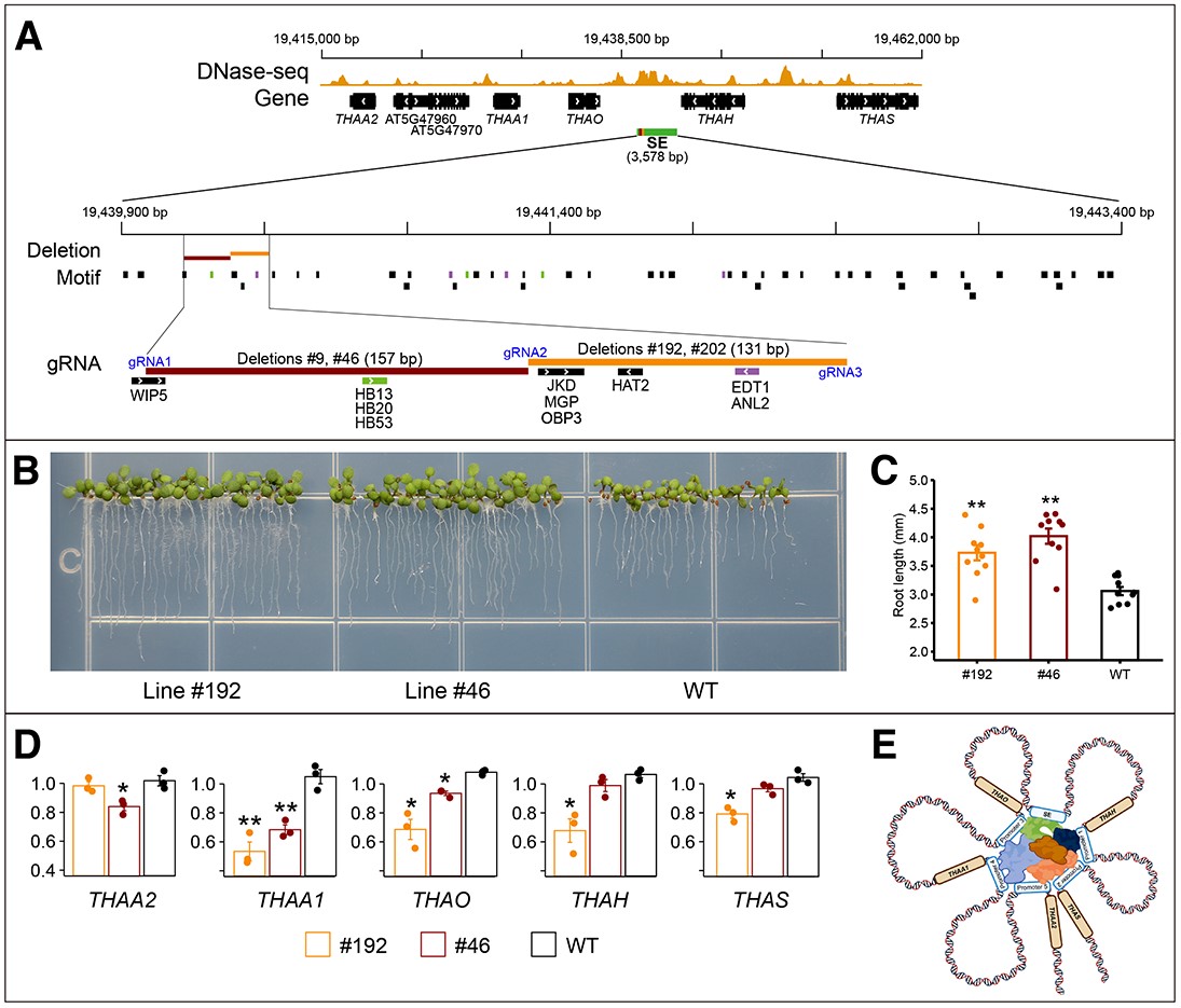 孟凡立研究員團(tuán)隊(duì)利用擬南芥DNase I超敏感位點(diǎn)測(cè)序數(shù)據(jù),在擬南芥全基因組范圍內(nèi)查找含有大的增強(qiáng)子簇的染色質(zhì)開(kāi)放區(qū)域,鑒定出749個(gè)候選超級(jí)增強(qiáng)子,最小的長(zhǎng)度為1.5Kb。超級(jí)增強(qiáng)子所在基因組區(qū)域比其他啟動(dòng)子染色體開(kāi)放區(qū)域?qū)Nase I更敏感。超級(jí)增強(qiáng)子與拓?fù)潢P(guān)聯(lián)域(TAD)緊密相關(guān)聯(lián)(圖1)。SEs及其預(yù)測(cè)靶基因與擬南芥器官和組織發(fā)育密切相關(guān)。這些研究結(jié)果證明擬南芥超級(jí)增強(qiáng)子與哺乳動(dòng)物超級(jí)增強(qiáng)子具有相同的功能特征。在由五個(gè)基因組成thalianol生物合成基因簇(BGC)中間定位了一個(gè)長(zhǎng)3578 bp超級(jí)增強(qiáng)子,并利用CRISPR/Cas技術(shù)創(chuàng)制超級(jí)增強(qiáng)子的突變體。超級(jí)增強(qiáng)子中131-157 bp小片段缺失顯著抑制基因簇中五個(gè)基因轉(zhuǎn)錄,導(dǎo)致擬南芥根明顯變長(zhǎng)(圖2)。此外,SE區(qū)域中T-DNA插入也導(dǎo)致基因簇五個(gè)基因轉(zhuǎn)錄改變。該研究結(jié)果表明超級(jí)增強(qiáng)子在擬南芥組織發(fā)育特性相關(guān)基因表達(dá)和類(lèi)操縱子基因簇基因共表達(dá)中發(fā)揮著重要作用。