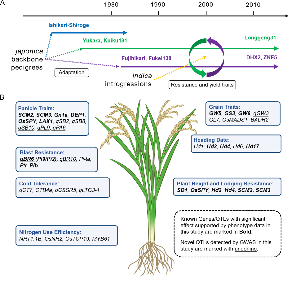 研究團隊收集了涵蓋東北稻區自1940年代到2010年代選育或引種的546份水稻品種資源,進行了重測序和22個農藝性狀表型的調查。研究發現東北地區水稻品種可歸類到3個具有不同進化特征的亞群(圖1),以石狩白毛為骨干的K3G1亞群在上世紀80年代前的黑龍江品種中占主導地位,隨后被以蝦夷和空育131為骨干的K3G2亞群取代;而以富士光和藤系138為骨干的K3G3亞群主要分布在遼寧和吉林,但隨著時間推移,其在黑龍江省的占比也越來越高。同時確認了秈稻滲入對東北水稻稻瘟病抗性和穗部性狀的重要貢獻。將品種選育印記追溯到123個已知或新檢測到的QTL位點以及大量秈稻滲入片段,系統總結了一些具有年代特征的關鍵性QTL位點或滲入片段,為后繼的品種設計選育提供了依據(圖1)。