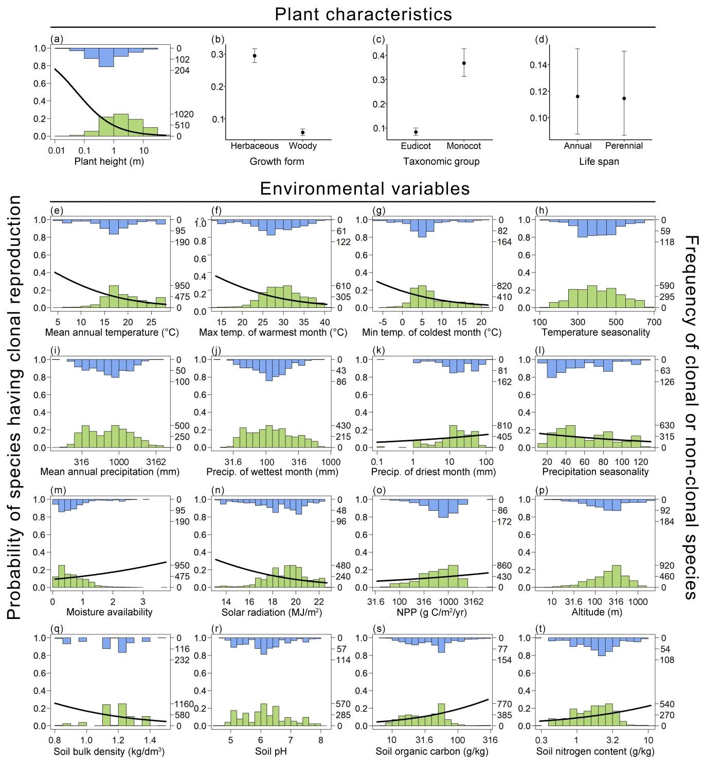 研究結果表明,克隆植物的概率與植物特征的關系更強烈,與環境變量的關系相對較弱。矮小植物、草本、單子葉植物更可能進行克隆繁殖,并且克隆植物在低溫、低太陽輻射、高水分供應、高凈初級生產力和高土壤有機碳和氮含量的環境中更常見。高大植物、木本、雙子葉植物通常只能有性繁殖,并且非克隆植物在干燥和土壤貧瘠的環境中更常見。這一重要發現將推進人們對植物繁殖策略大尺度格局及兩種繁殖方式進化意義的理解,表明克隆繁殖是植物在資源豐富的環境下進行種群擴張的策略,而不是在環境脅迫條件下替代有性繁殖的保障策略。