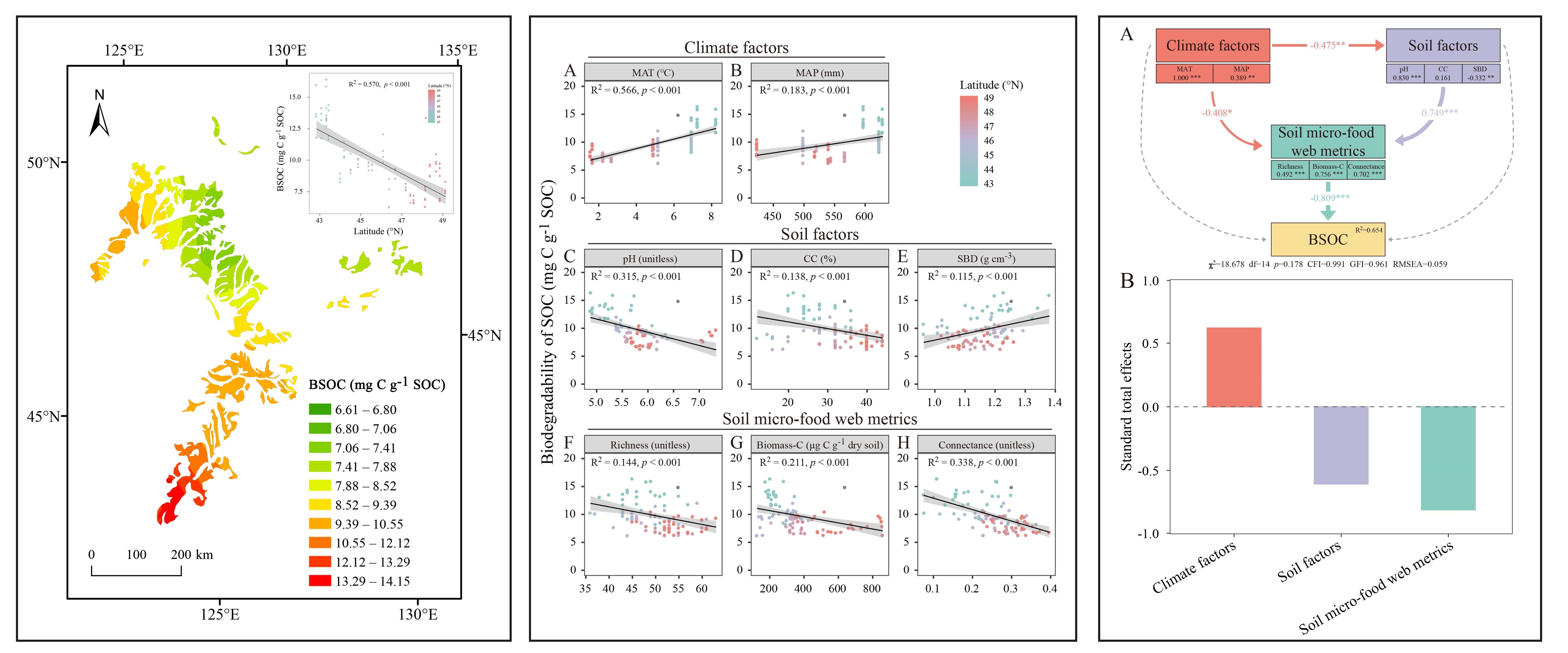 中國科學院東北地理與農業(yè)生態(tài)研究所黑土有機碳與保護性耕作學科組科研人員以中國東北典型黑土區(qū)43°N-49°N緯度范圍內的農田土壤為研究對象,將土壤生物、氣候、土壤因子耦合起來,在區(qū)域尺度上深入揭示了農田黑土有機碳生物降解性的緯度分布格局及其驅動機制。研究發(fā)現(xiàn)土壤有機碳生物降解性隨緯度增加呈現(xiàn)北低南高的分布格局,該變化趨勢主要受到隨緯度變化的土壤微食物網特性(豐富度、生物量碳和連通性)、氣候因子(年平均溫度和年平均降水)、土壤因子(土壤pH、土壤粘粒含量、土壤容重)的調控作用。通過結構方程模型發(fā)現(xiàn),土壤微食物網特性是影響土壤有機碳生物降解性最直接且最重要的驅動因素。研究結果強調了土壤生物在調控農田生態(tài)系統(tǒng)土壤有機碳礦化和固存中的重要作用。