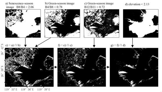 結果顯示,新方法可以高效構建生長季和枯黃季構成的雙時相影像、有效減少誤分類像元、等效逼近已訓練隨機森林模型。此外,本研究提供了一套總體精度92.5%的10米分辨率2020年海岸鹽沼植被分布數據,還構建了針對雙時相影像識別海岸鹽沼植被的潛在機理,即生長季的水信號被植被掩蓋、枯黃季植被枯萎后水信號得到增強。針對雙時相影像識別海岸鹽沼植被分布的潛在機理,進一步解析決策規則的各組成部分的作用。發現:枯黃季B8senescence/B4senescence < 2.06 對包含鹽沼植被的高含水率土地覆被響應,生長季B4green/B8green < 0.78 對包含鹽沼植被的低含水率土地覆被響應,二者的交集已有效包含鹽沼植被(圖2)。剩余部分決策規則分別作用于去除不透水面和水體。可以推測,雙時相影像下鹽沼植被冠層導致的水信號變化或是其遙感識別的潛在機理。