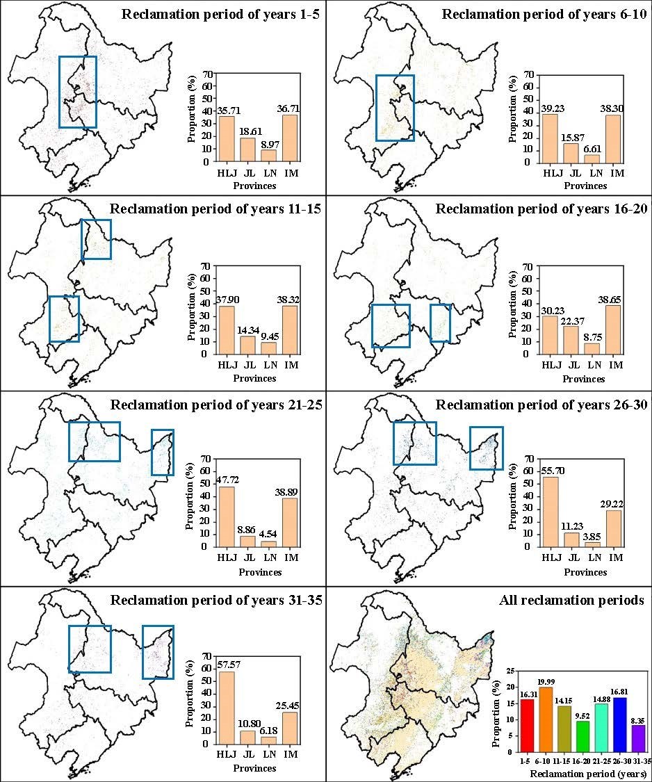 圖2東北地區耕地開墾結果(藍色邊框表示不同開墾年限大范圍分布區域)