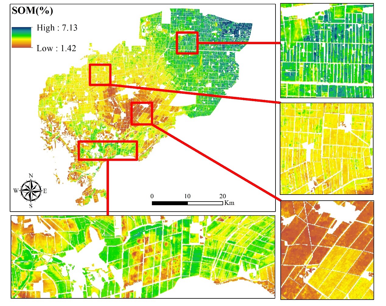 耕地土壤有機(jī)質(zhì)(SOM)含量制圖是數(shù)字土壤制圖中最重要的組成部分之一,其對(duì)農(nóng)業(yè)精準(zhǔn)管理、碳循環(huán)評(píng)估都具有重要意義。使用裸土期影像結(jié)合實(shí)地采樣點(diǎn)進(jìn)行制圖是東北黑土區(qū)耕地SOM含量制圖目前最流行的手段,然而隨著保護(hù)性耕作推廣導(dǎo)致秸稈覆蓋增多使得該手段越來(lái)越局限,因此探索更多的SOM含量制圖手段十分必要。