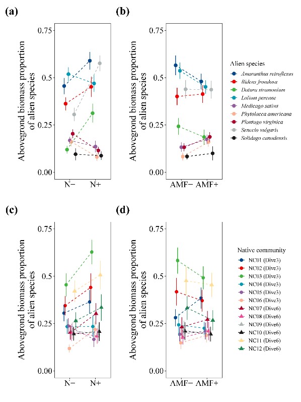 基于這一背景,中國科學院東北地理與農業生態研究所和東北師范大學的研究人員,以9種入侵植物和12個人工群落(兩個多樣性梯度)構建的108個入侵系統為目標,結合養分添加和AMF添加處理,探究了不同生物和非生物環境下生物多樣性阻抗入侵的機制。