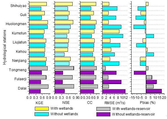 圖2. 有/無濕地—水庫聯合調蓄的流域水文模型擬合優度指數的差異性